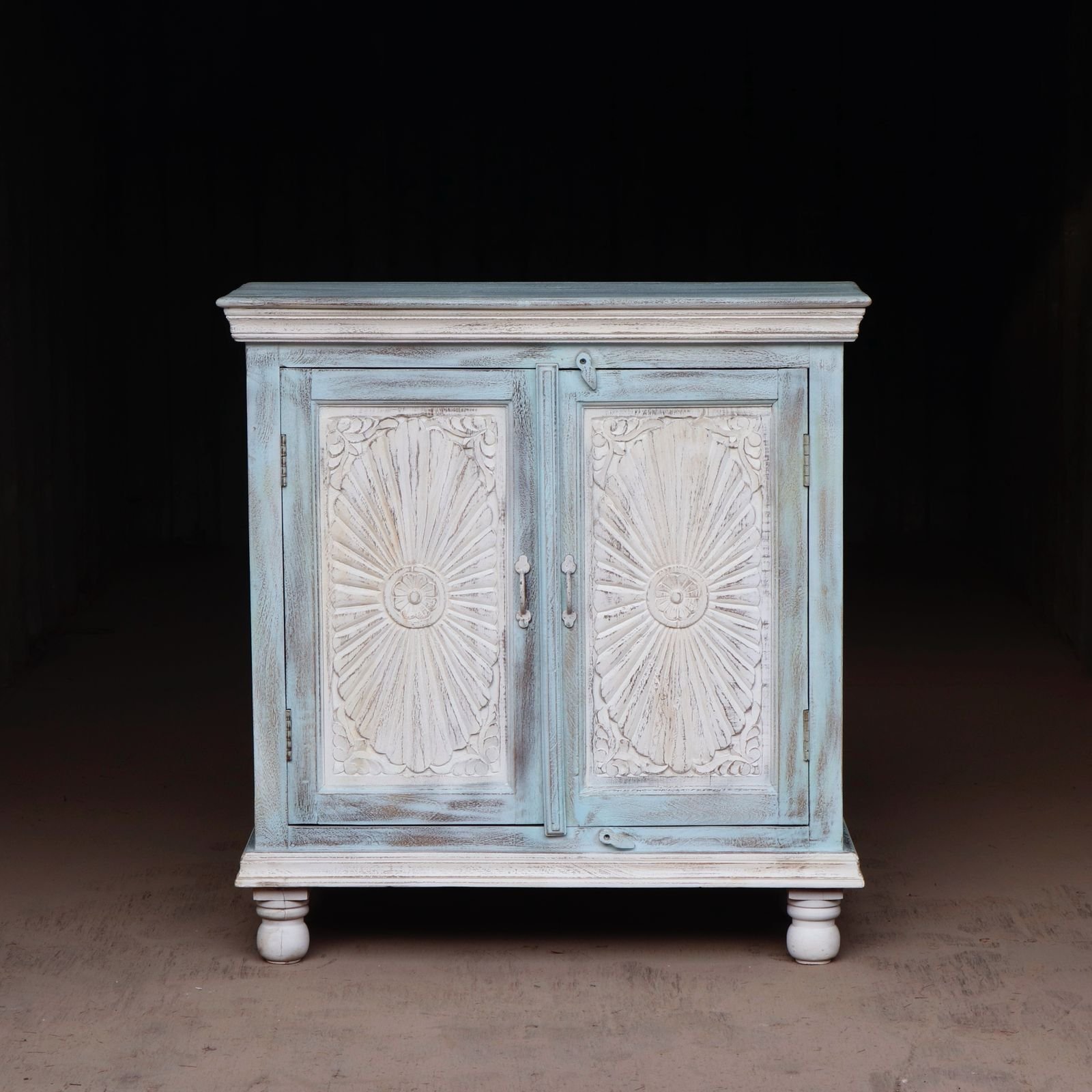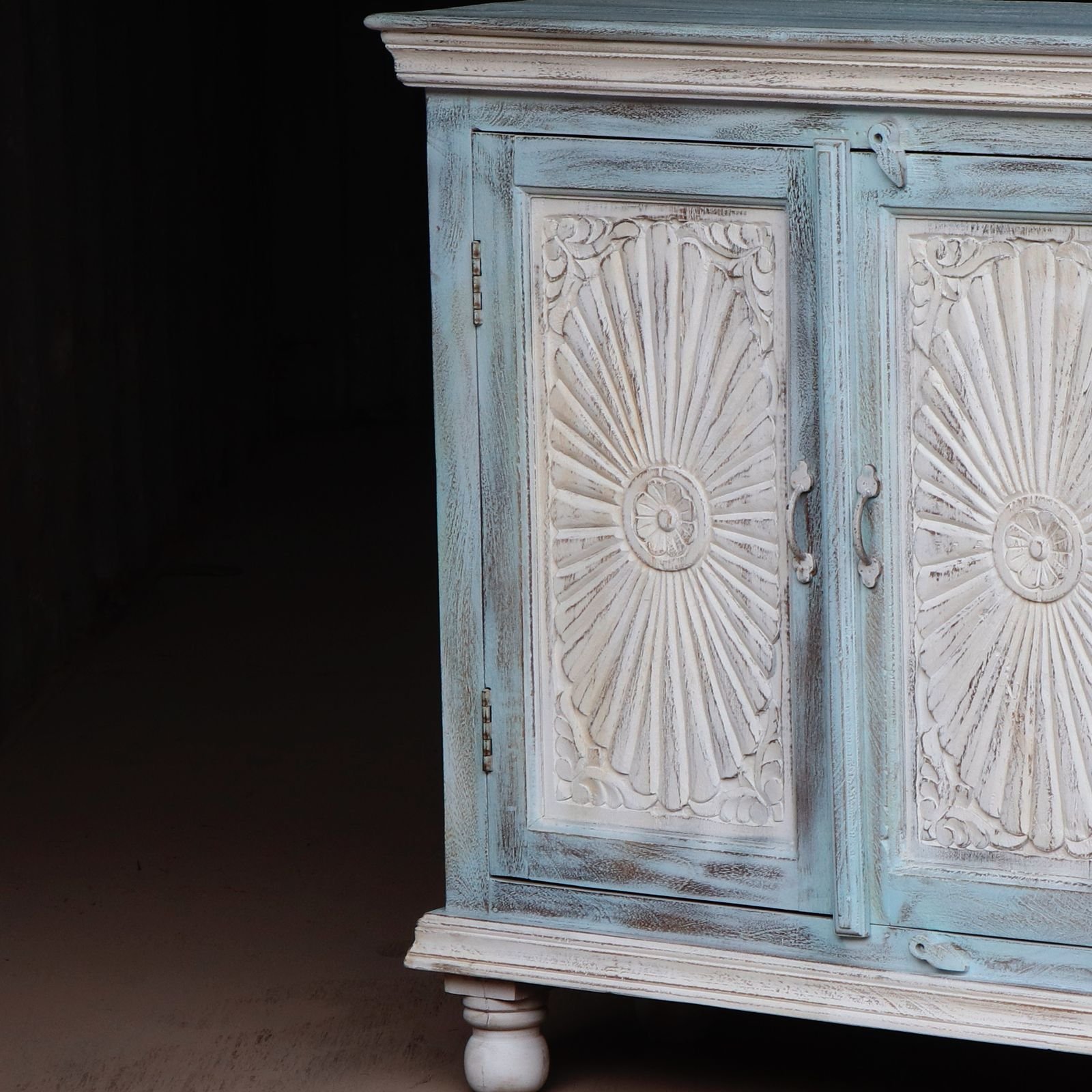 Add timeless elegance to your home with our Hutch Cabinet, crafted in premium solid wood and finished in a rare distressed aqua-blue tone. This statement storage cabinet features intricate hand-carved sunburst detailing that reflects true artisan craftsmanship.